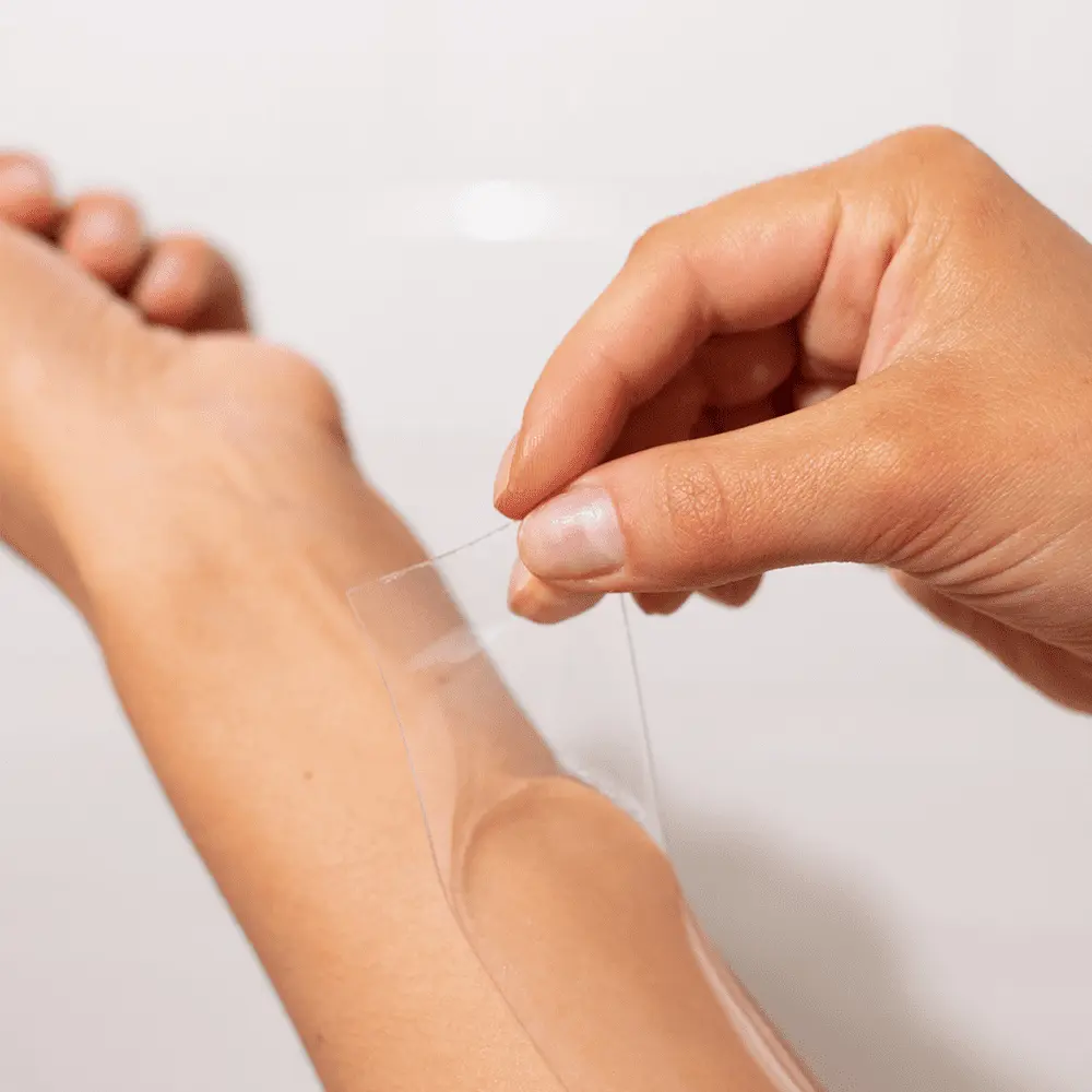 • Then, remove the protective plastic cover of the scar sheet and apply the sticky side to the scar.
